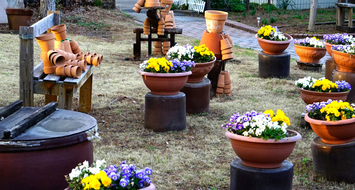 植木鉢家族が公園をほほえみの世界に