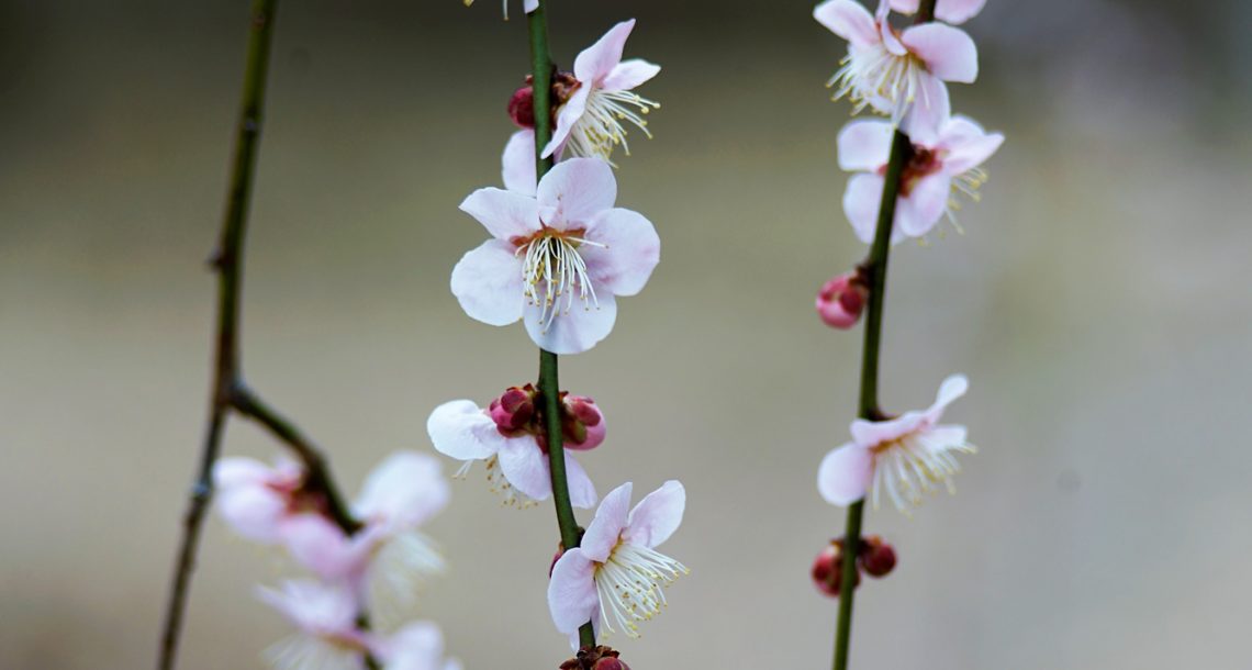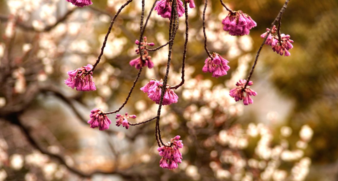 ピンクの釣鐘状のかわいい花、桜のシーズンの始まりです。・・・・・向島百花園にて
