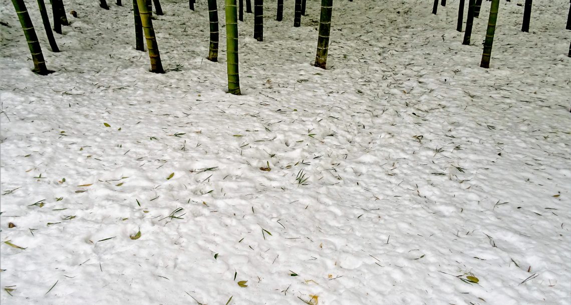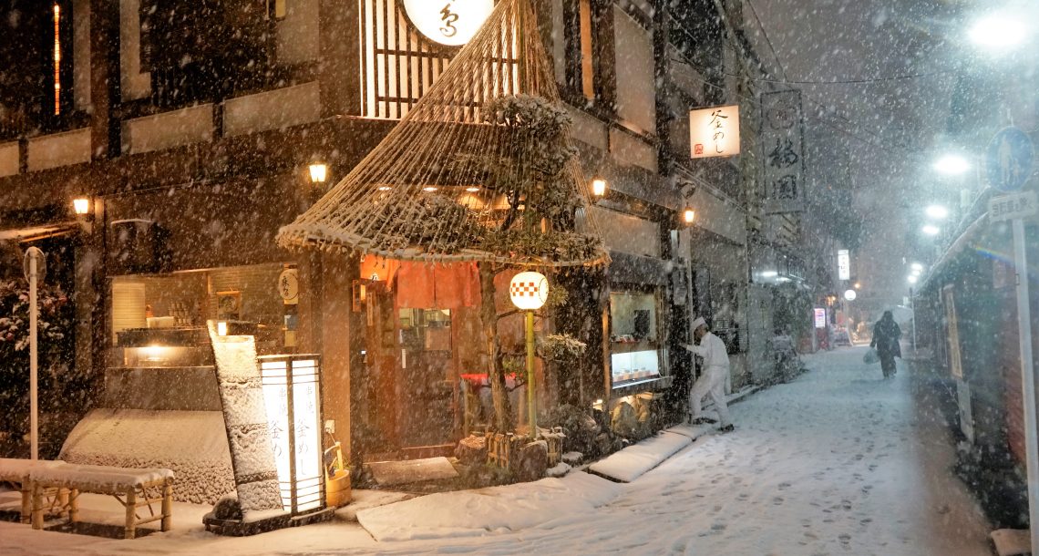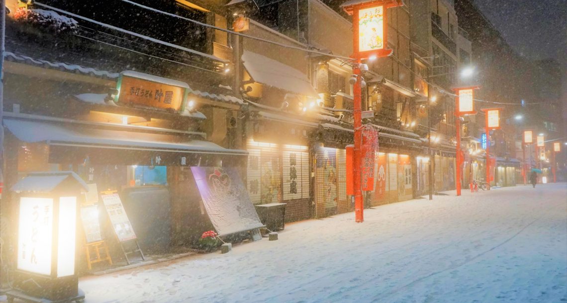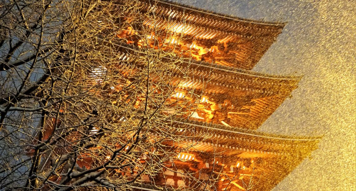 吹雪に朱色のライトが当たり五重の塔に火の粉が降っているようです。