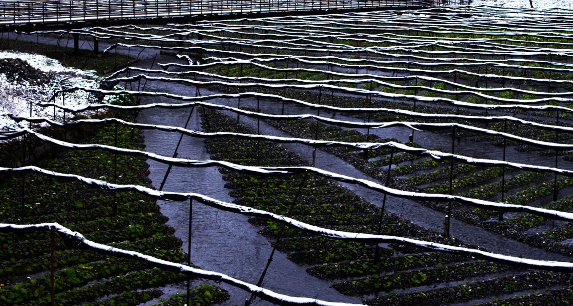 日除けの上に雪が乗り、わさび畑の上をリズミカルに流れているようでした。