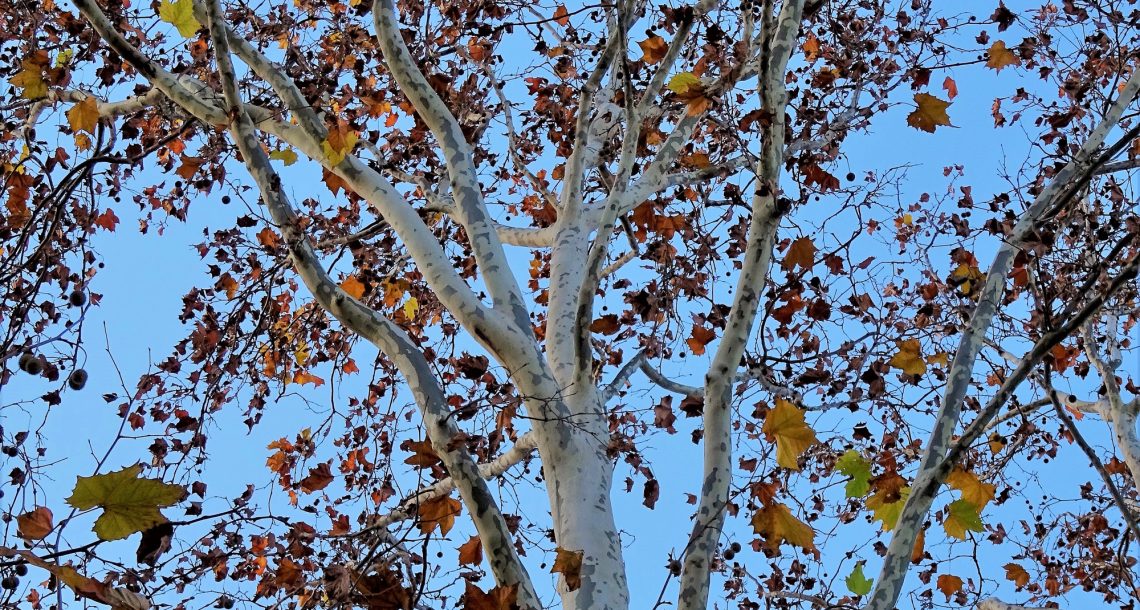 プラタナスの葉が残り少なくなりました。 夕陽を浴びているのに、 寂しそう・・・・・