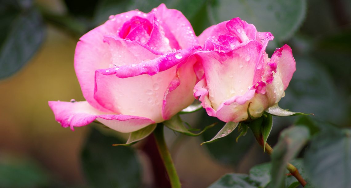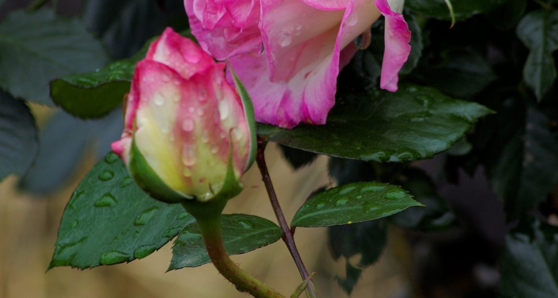 雨の日、親子の薔薇の会話が聞こえそう。 ピンクの薔薇の花言葉は「暖かい心」。