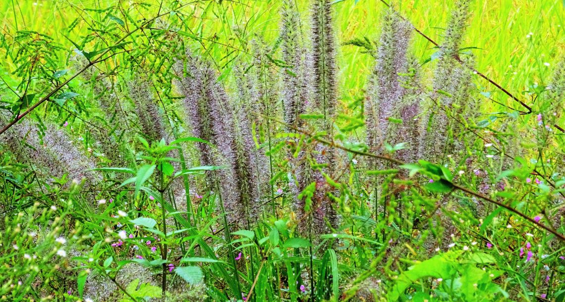 田んぼの畦道は様々な植物でいっぱい、朝露をまとい生き生きと美しく。